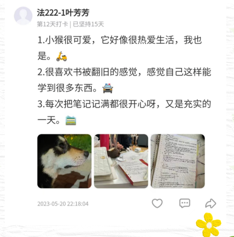 法国雕塑家罗丹说:“美是到处都有的。对于我们的眼睛,不是缺少美,而是缺少发现。”法222-1班的叶芳芳同学就有这样一双善于发现美的眼睛。工整而详实的课堂笔记、母亲节送给妈妈的花、家里养的可爱的狗狗“小猴”,目光所及之处那美丽的风景,都被她一一捕捉、记录并分享,正是这样的小确幸,赋予了我们生活的意义。