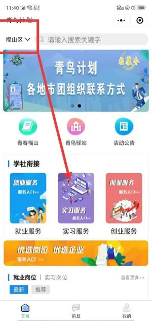 —实习岗位”→左上角选择所在县市区→实习服务→选择心仪的岗位投递简历即可。