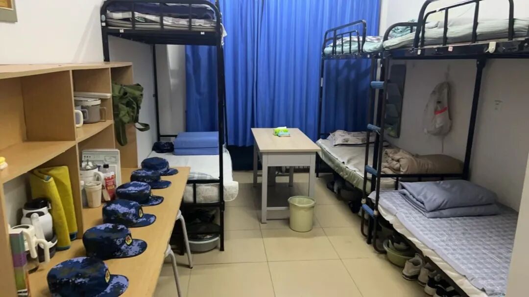 揣着饱餐的满足回到宿舍,我们依旧没卸下“认真”劲儿。照着教官教的诀窍,手指捏着被角反复叠压,把被子塑成方方正正的“豆腐块”;洗漱用品摆成一条直线,桌面擦得锃亮,连拖鞋都归置得整整齐齐。看着焕然一新的宿舍,连军训后的休息时光都变得更舒心啦!