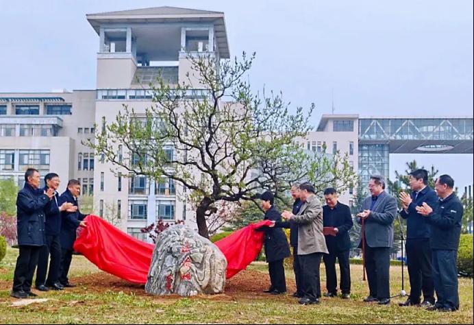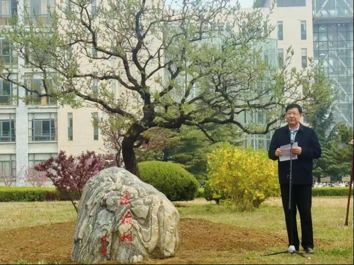 法61班向学校捐赠百年文冠树,取名“法治树”,刻于泰山石上,寓意“学求文冠,法如泰山”。王强、郭明瑞、房绍坤、汪建成与法61班校友代表孙庆雷、宋文英共同为“法治树”揭幕。