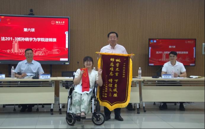2024届毕业生代表法201-3班孙晓宇同学向学院送上满含心意的锦旗,感谢学院对所有学子的关心、呵护与培养。