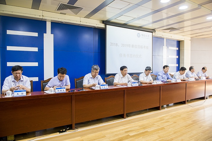 张伟指出,要加压奋进,切实推动各项工作任务落到实处。签订考核任务书,目的就是进一步明确各个责任部门和各学院(部)、直属单位的工作职责,将学校总体工作任务科学地分解到各个单位,形成强有力的工作合力。一分部署,九分落实。制定出比较完善的文件或政策只是万里长征的第一步,关键在于落实,在于是否能够用扎实有效的实际行动将好的政策转化为推动事业发展的强大动力。张伟强调,要提高政治站位和思想境界,以习近平新时代中国特色社会主义思想为指引,全面贯彻落实党的十九大精神,认真落实中央、省委以及学校党委的决策部署,有力推进学校年度重点工作任务,真抓实干,务求实效。要牢牢把握山东省新旧动能转换重大工程建设和烟台市校城融合发展等宝贵的历史机遇,注重结合各单位实际,全面开展服务工作,各个学院、学科、专业,都要找准聚焦点和切入点,比如一个学院至少对接一个产业,一个学科至少对接一个企业,积极向相关产业靠拢,做好产业对接工作,提升服务成效,提高事业发展水平。各个责任部门要以认真负责的态度,切实加大平时考核的工作力度,公开、公平、公正、准确地开展有关考评工作,真正让工作扎实、干出成绩的单位脱颖而出。各个单位要不断强化责任意识和担当意识,大力激发大家的热情与激情,营造人人有目标、人人有任务、人人有作为的良好工作氛围。张伟强调,改革发展只有进行时、没有完成时。工作落实没有尽头,只能撸起袖子加油干。2018年是实施“十三五”规划承上启下的关键一年,希望各个单位把师生员工的热情与激情更充分地激发出来,团结拼搏,加压奋进,以踏石留印、抓铁有痕的精神狠抓落实,不断开创各项事业又好又快、更好更快发展的崭新局面!