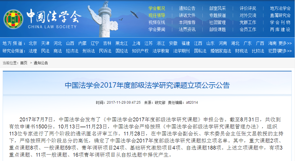 2017年11月29日,中国法学会公布了“2017年度部级法学研究课题立项公示公告”,韩国av
