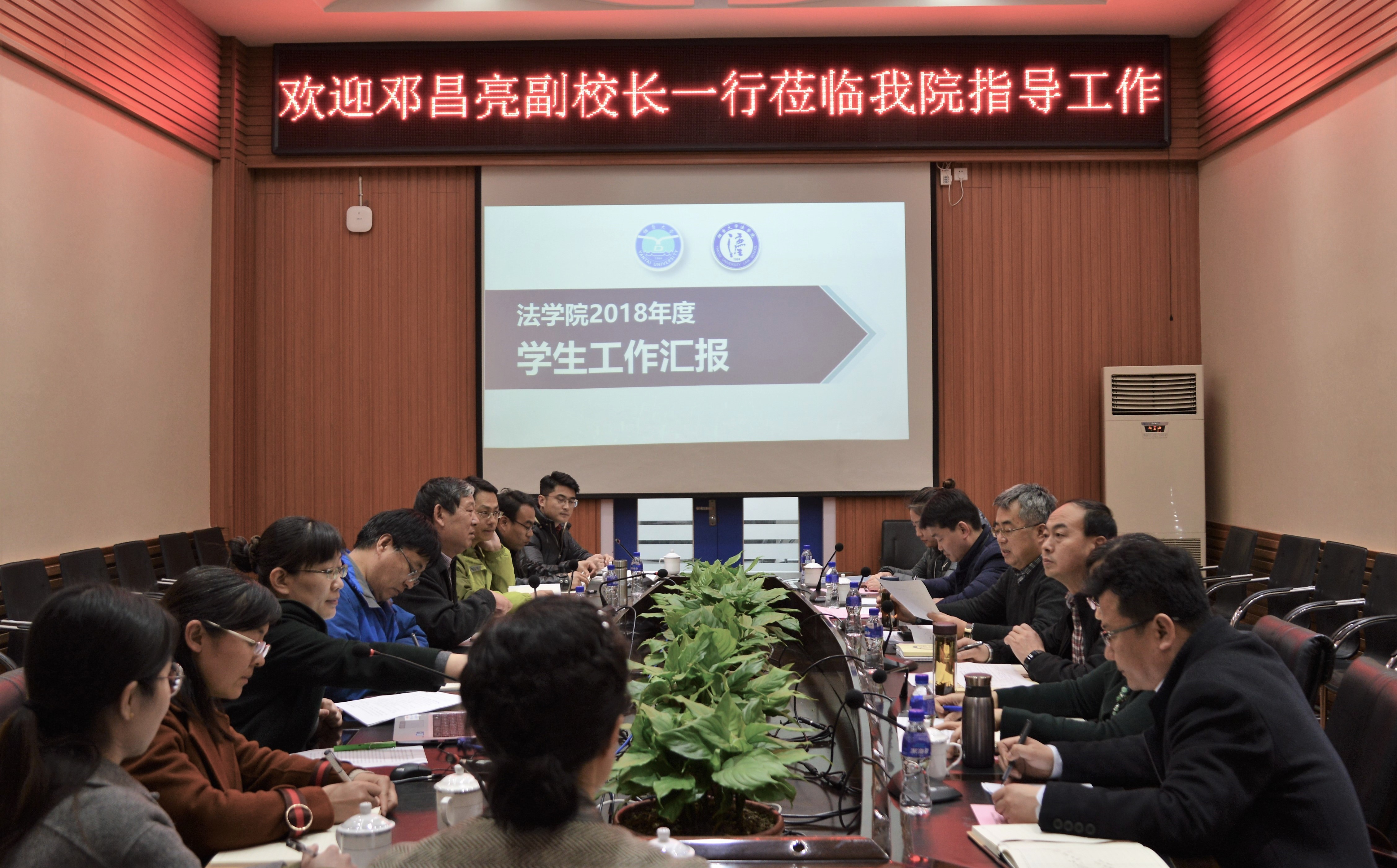 副校长邓昌亮听取了学院党总支副书记罗秀秀关于学院近三年学生工作成绩、2018年学生工作回顾、学生工作中存在的困惑以及未来展望的工作汇报。罗秀秀在汇报中谈到,学院积极响应学校下移工作重心的要求,并注重把握关键时间节点进行思想引领和价值引导,举办了“学宪法.讲宪法”等活动并成立了韩国av “谠言直声”宪法宣讲团;学院坚持学生自我管理、自我教育、自我服务的理念,积极为学生们搭台子、铺路子、架梯子、开方子,学生也抓住机会,成功举办了包括第一届法律志愿服务组织未来发展半岛论坛在内的各项活动;学院积极创新,构筑实践、创新、文化、示范四位一体的育人体系,并合理利用学院资源在学生心理工作方面开展 “四个一”工程;学院也意识到学生工作中关于学风、就业和科技创新等工作存在的问题,并在此基础上加强工作研究和队伍建设等工作。学生工作委员会成员、院领导等也都对学生工作发表了意见,各位辅导员老师也就调研内容进行了发言。