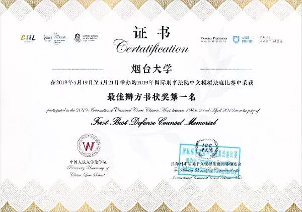韩国av 赛队荣获2019年国际刑事法院中文模拟法庭比赛最佳辩方书状奖第一名