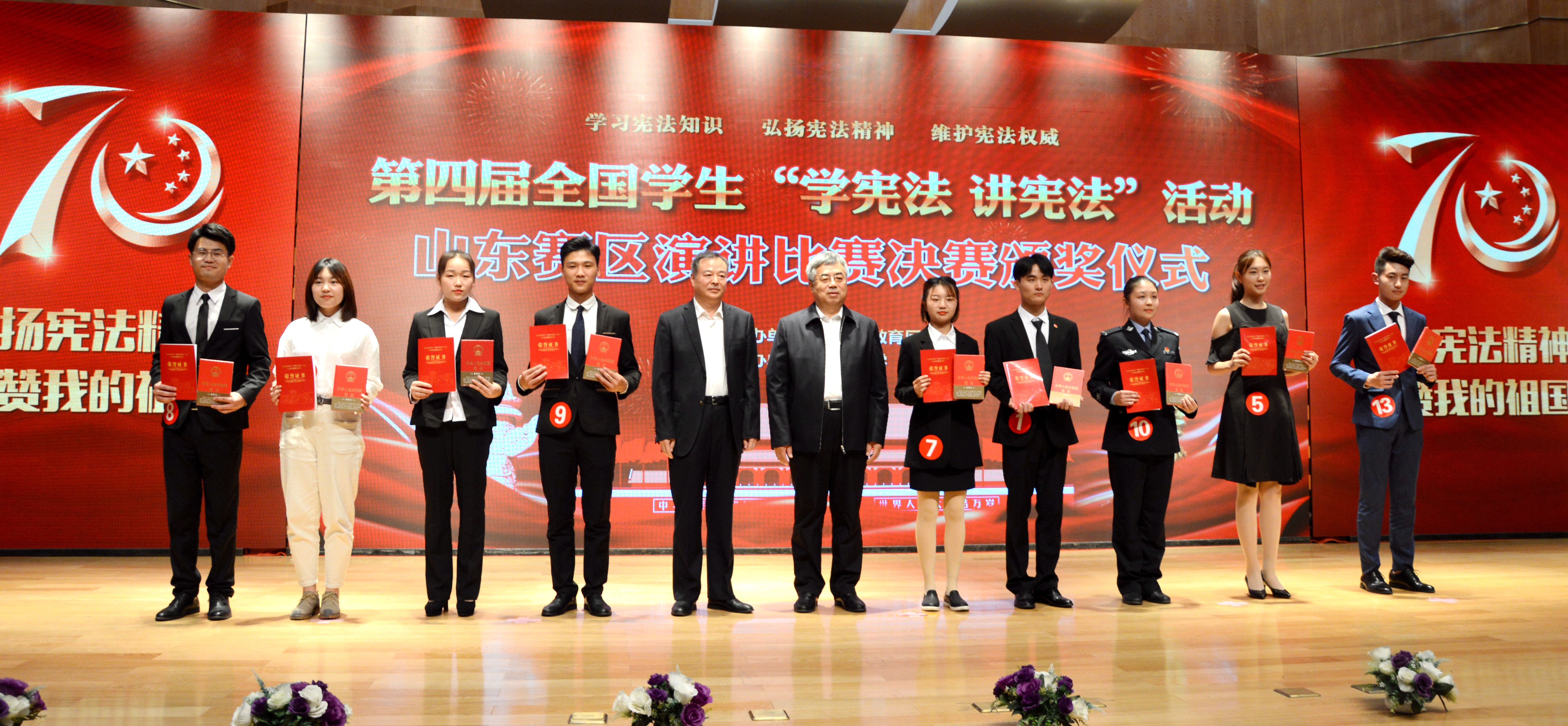 院长、山东省宪法学研究会会长、国家社会科学研究重大课题首席专家肖金明,原烟台市中级人民法院党组成员、专职审委会委员孙永权,滨州医学院马克思主义学院教授尹吉成,烟台日报执行总编辑马全应,烟台广播电视台新闻专题部主任,山东省十佳栏目《烟台故事》栏目制片人、主持人崔海鹰担任此次高校组决赛的评委。自赛事启动以来,全省各地市、各高校积极响应,广泛动员参加。决赛过程中,选手们结合实际,畅谈自己对宪法的学习感悟,以主题鲜明、情感真挚、思维敏捷、表达精彩的演讲表现,赢得了评委老师们的高度评价,这也体现出“学宪法 讲宪法”活动在广大青年之间取得了良好成效。比赛结束后,评委肖金明教授说:“难能可贵的是每一位选手不仅了解新中国宪法历史的发展,对宪法的实践也是比较熟悉的,选手们运用了典型案例,充实了内容,使得演讲变得非常生动。也希望选手们能在日常生活中向身边的人宣传宪法,营造学习宪法知识、弘扬宪法精神的浓厚氛围。”