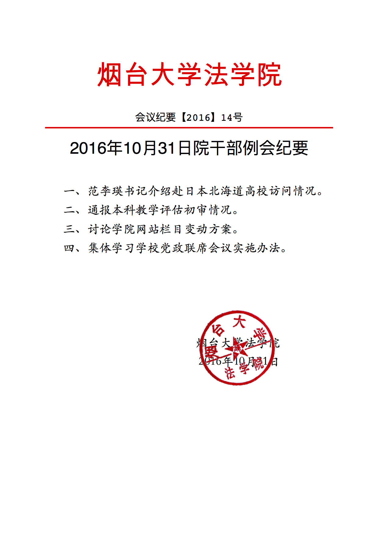 2016年10月31日院干部例会纪要