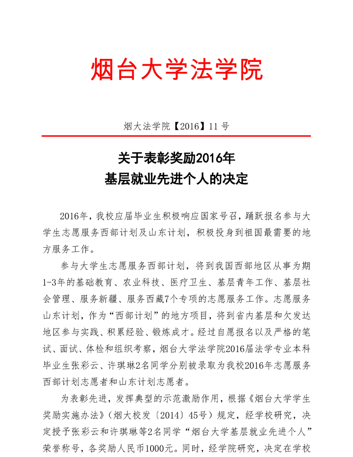烟大韩国av 【2016】11号关于表彰奖励2016年基层就业先进个人的决定