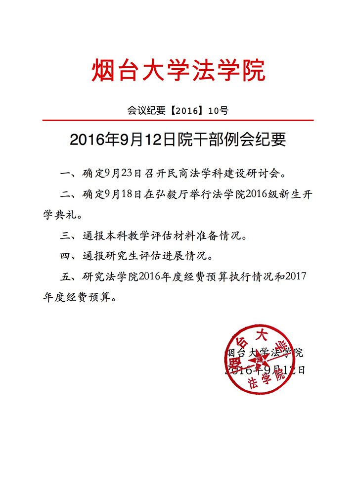 2016年9月12日院干部例会纪要
